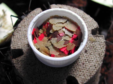 - フレークタイプのエサ(Te社製) :観賞魚の用品を扱っているお店で購入出来るフレークタイプのエサです。(今回は一番価格の安い金魚用のエサを購入しました)
