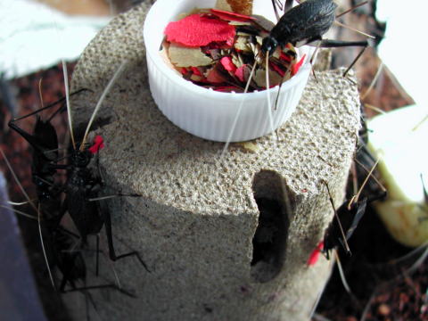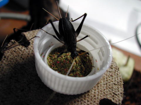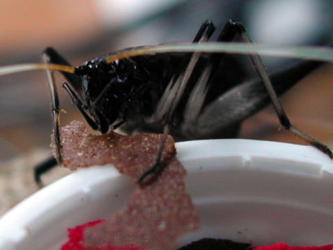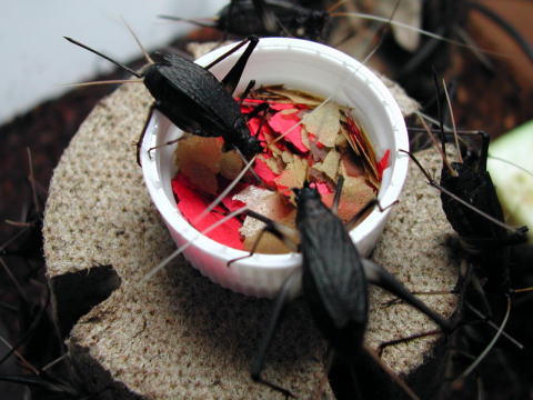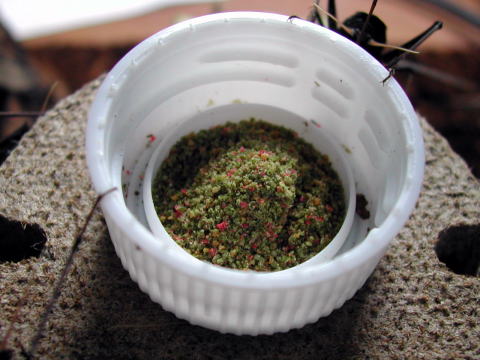 次に短所、フレークタイプは持ち出しが可能な為に、食べ残しが飼育ケース内を汚す可能性があります。しかし、食べ残しの破片が大きい為に、食べ残しを発見する確率も高いみたいで今まで食べ残しらしい物は確認出来ていません。また、粉末タイプの短所は、持ち出しが出来ない為に1匹当たりのエサ場の占有時間が長くなりエサを食べられないスズムシが出てくる可能性があると考えられます。