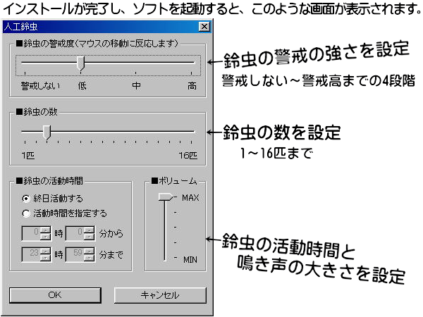 この人工鈴虫(以下ソフト)は、デスクトップ上で鈴虫の音色を楽しむアクセサリソフトで様々な設定が可能です。