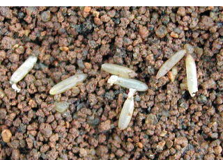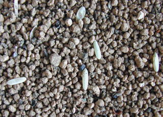 水やり直後の写真です。地表にある卵は直接水に当たり、象牙色から透き通ったベッコウ色へ変わりました。右から2つ目の卵はペチャンコにつぶれています。