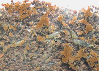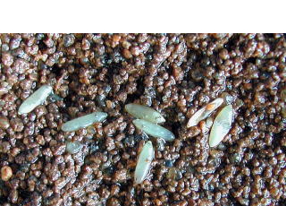 こちらも中央の卵に縞模様が確認出来ます。こちらの方は5月2日に幼虫第1号が孵化しました。この横縞は、幼虫の胴体部分の模様ではないかと考えられます。幼虫の写真は、スズムシギャラリー(幼虫版)・スズムシ成長記(2004年版)の方で見られます。