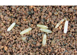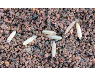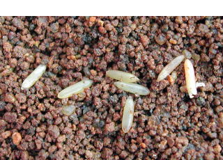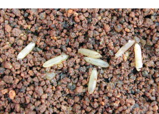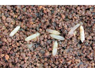 卵の水やりの前で飼育マットがカラカラに乾燥している状態です。卵が象牙色になっています。