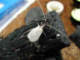 天気:雨 室温:23.5℃初めの孵化が始まってから、毎日の様に生まれてきています。現在50匹を超えた位です。左の写真は以前に撮った物ですがご了承下さいm(_ _)m。これからどの位まで増えていくのか楽しみです。このページでは、変化が有った時点で更新しますので、更新ペースは随時という事になります。生まれたばかりの幼虫は硝子細工みたいに繊細で真っ白です。