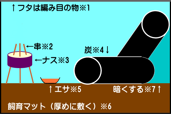 - フタは外敵が入らない様な編目の物を使う。(虫かごのフタも可)